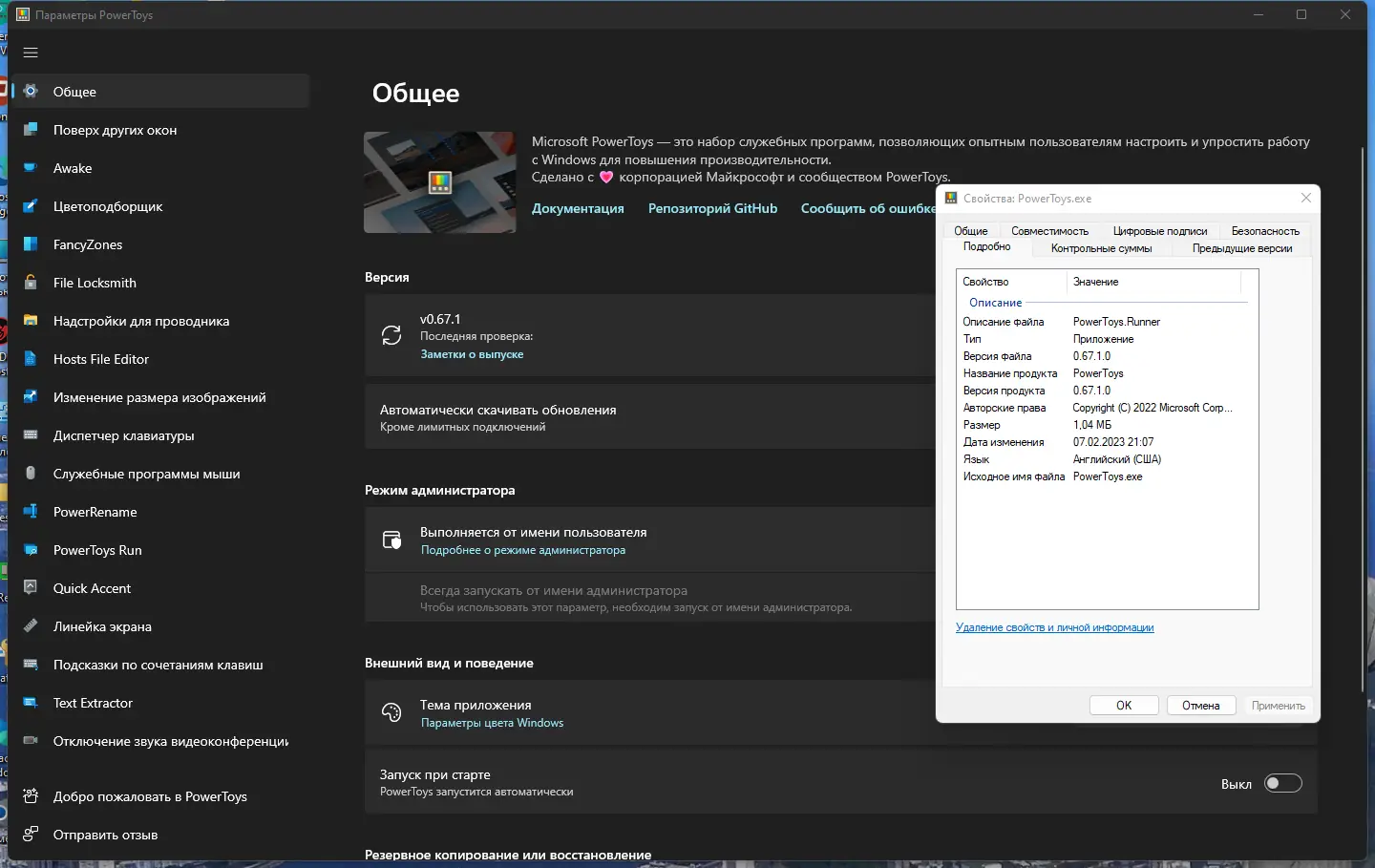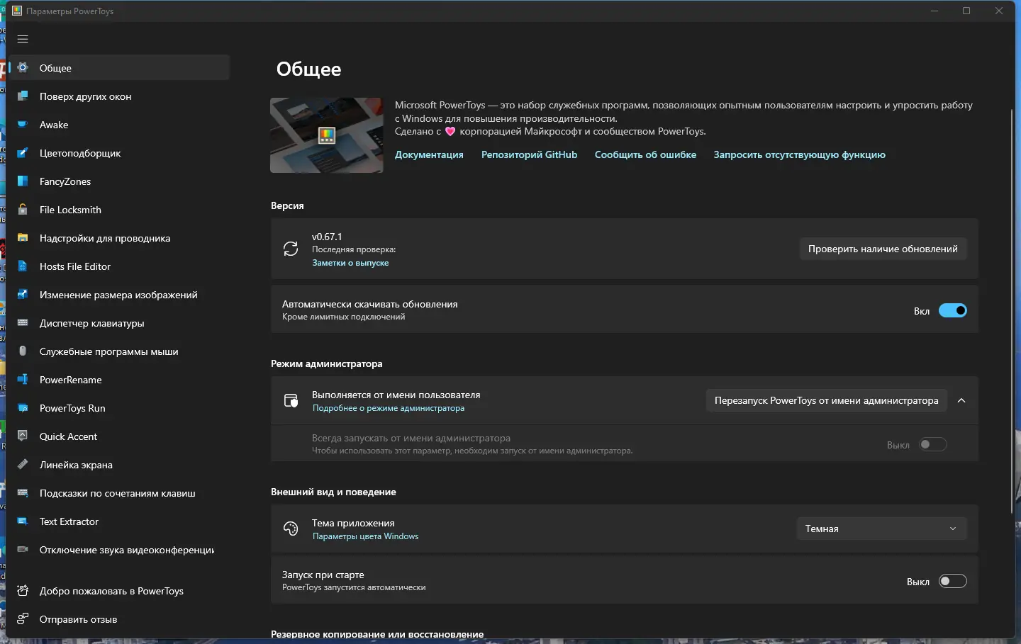Обратите внимание, что для полноценной работы функций, таких как Keyboard Manager или FancyZones, потребуется запустить PowerToys с правами администратора.
