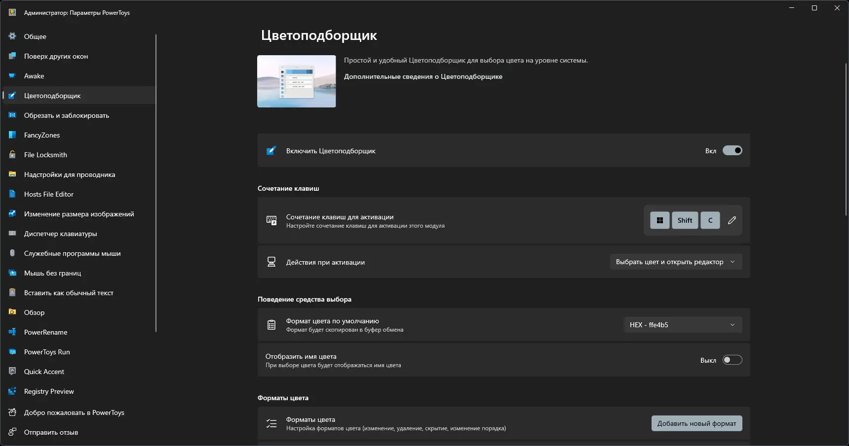 - Цветоподборщик — инструмент «Пипетка» для определения цвета любой точки экрана, вызываемый комбинацией Win+Shift+C.