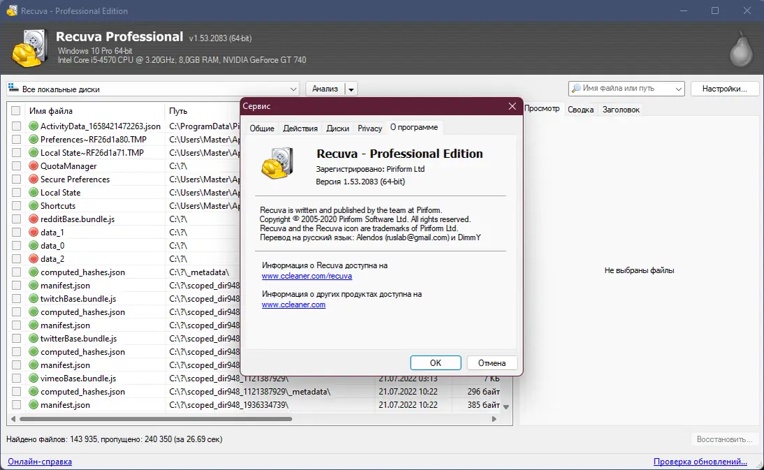 - Восстановление удаленных данных с поврежденных или форматированных носителей, а также съемных устройств при помощи Recuva.