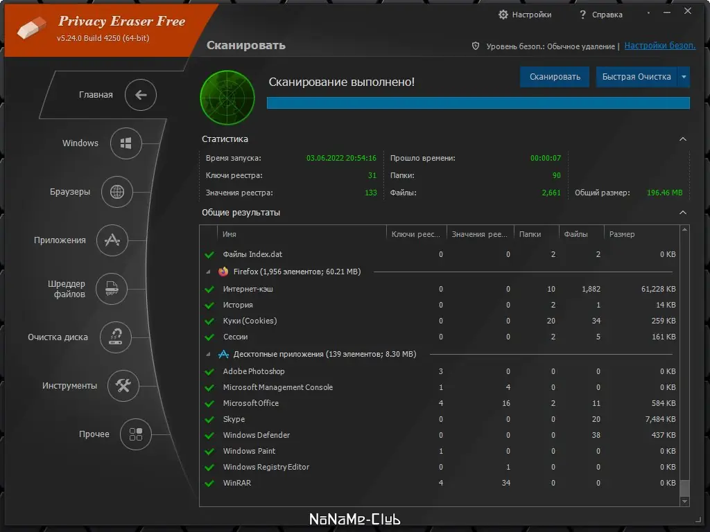 Privacy Eraser Free — это надежное решение для удаления истории активности на ПК. Она стирает кэш браузеров, куки, историю посещенных страниц, временные файлы, файлы журналов и многие другие цифровые следы. Инструмент способен обеспечить безопасность личных данных, ускорить работу интернета и повысить стабильность системы. Встроенная поддержка более 250 бесплатных плагинов позволяет удалять следы, оставляемые сторонними приложениями, такими как Adobe Reader, Microsoft Office, WinRAR и другие.