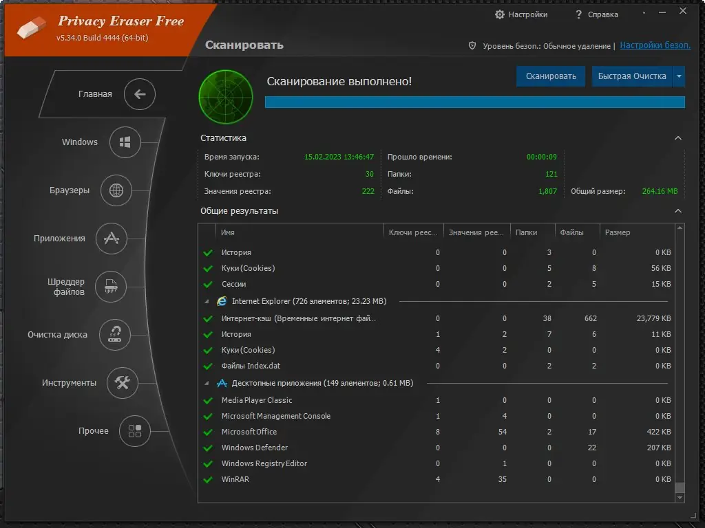 Privacy Eraser — это комплексный инструмент, предназначенный для защиты приватности пользователя путем быстрого и эффективного удаления истории активности в Интернете и системных следов деятельности. Совместим со всеми современными версиями Windows, включая Windows 7, 8/8.1, 10 и 11, а также поддерживает как 32-, так и 64-битные системы. Инструмент позволяет очистить кэш браузеров, куки, автозаполнение форм, сохраненные пароли, файлы index.dat, истории поиска Windows и многое другое. Одним щелчком мыши программа стирает следы работы различных программ и системных компонентов, ускоряя работу компьютера и повышая его стабильность.