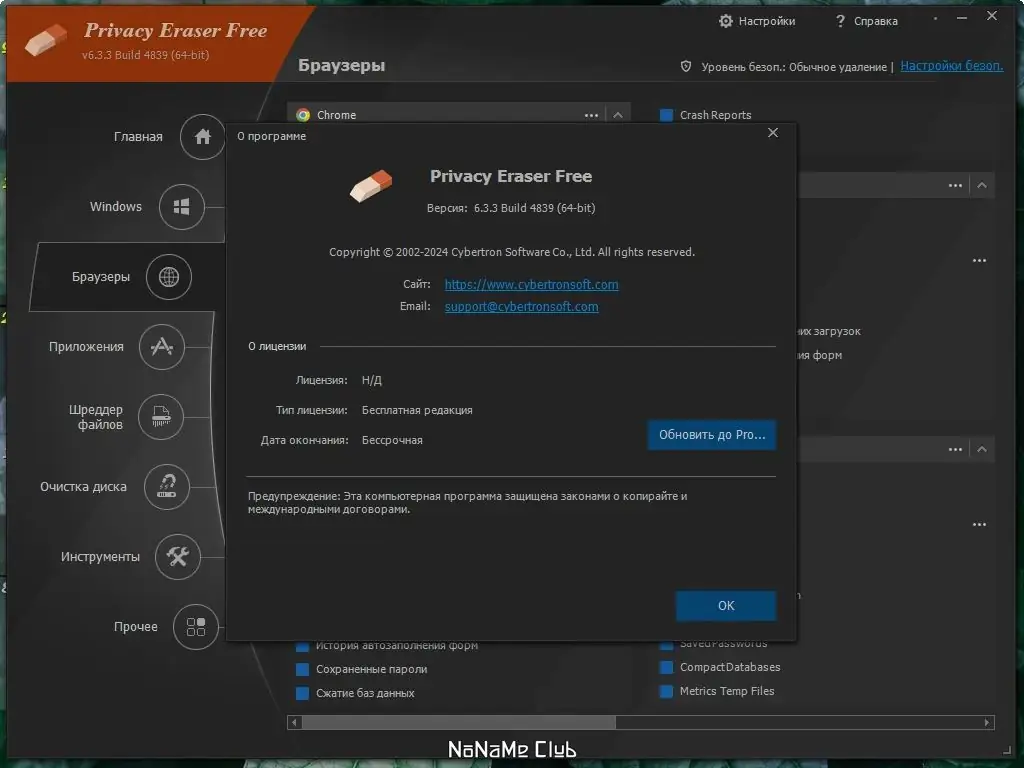 Privacy Eraser — бесплатный инструмент для защиты личной информации и ускорения работы ПК за счет удаления цифровых следов активности в Интернете и системных данных.