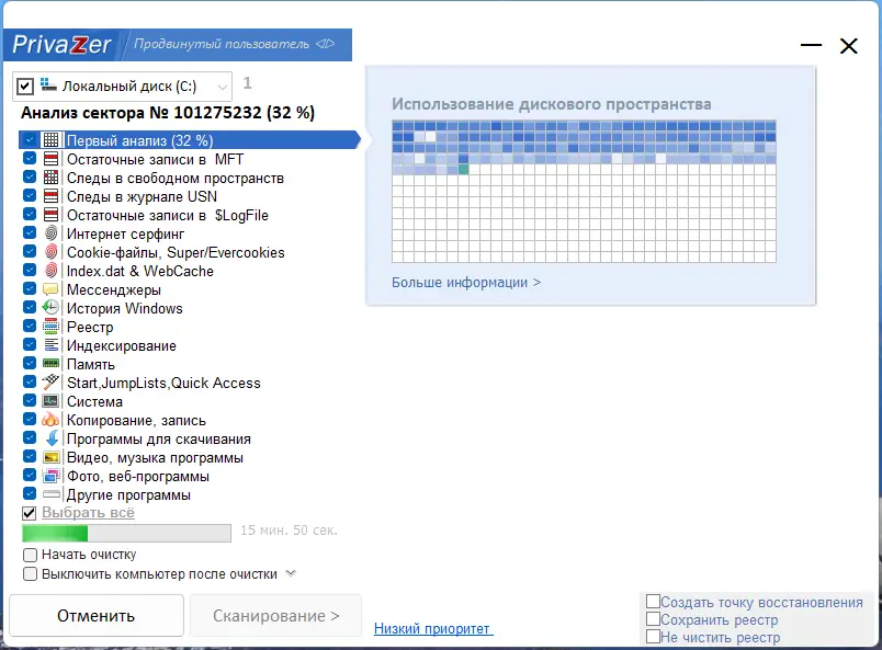 Программа PrivaZer предназначена для удаления следов эксплуатации системы, таких как история посещений, cookies, записи в реестре и другие временные или конфиденциальные файлы. Она подготовит детальный отчет о найденных следах и предоставит возможность их безопасного удаления при помощи современных алгоритмов. Обладает быстрым режимом работы, удобным интерфейсом и поддержкой съемных устройств, включая USB-ключи. Также программа создает резервные копии изменений, вносимых в реестр, что обеспечивает дополнительную безопасность пользователей.