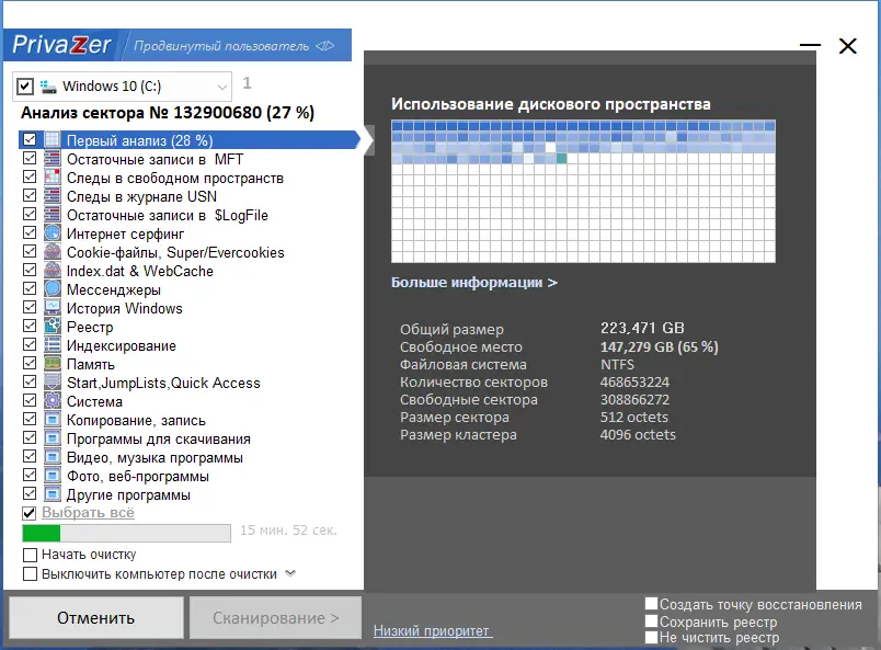PrivaZer — это полезная утилита, которая поможет вам полностью очистить ваш компьютер от следов использования. Она подготовит детальный отчет со списком всех обнаруженных следов, таких как записи в реестре, история посещений сайтов, cookies и другие остаточные файлы. Программа обладает быстрым алгоритмом работы, удобным интерфейсом и поддерживает съемные устройства и USB-ключи. Помимо этого, она создает резервные копии внесенных изменений и предоставляет возможность выбрать и удалить конкретные следы по вашему усмотрению.