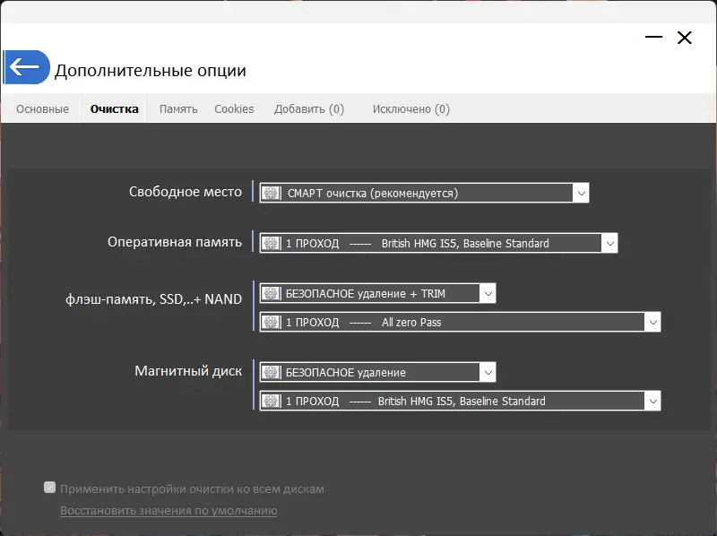 - Удаление следов использования программ и служб, включая Jumplists, корзину и временные файлы;