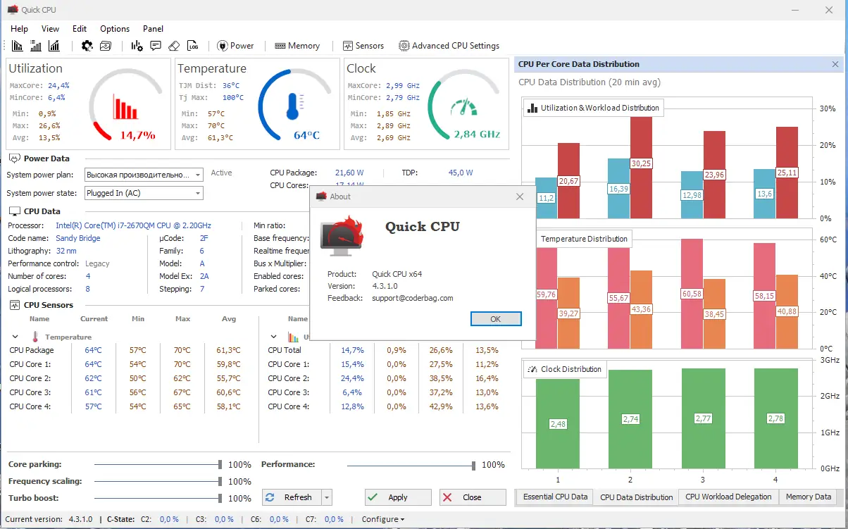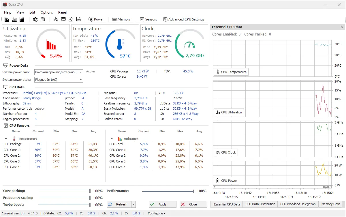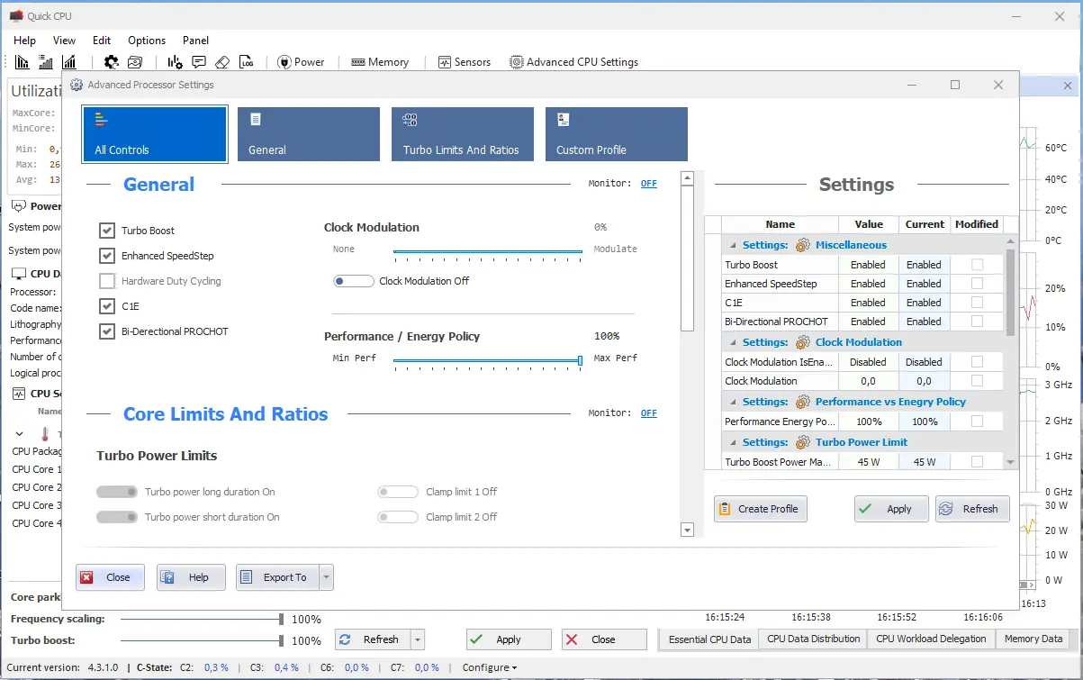 Quick CPU — это мощное приложение для точной настройки и мониторинга производительности вашего процессора. Оно позволяет управлять такими параметрами, как парковка ядер, масштабирование частоты, Turbo Boost, C-States, Speed Shift и FIVR Контроль. В результате вы получаете возможность оптимизировать работу системы, повысить её эффективность и снизить энергопотребление. Программа совместима с различными версиями Windows и доступна как в x32, так и в x64 Bit вариантах, что делает её универсальным решением для различных конфигураций.