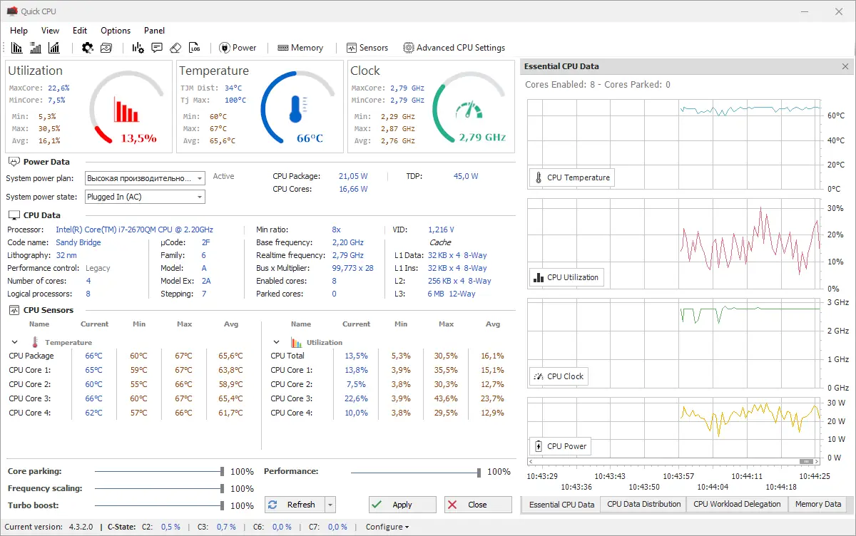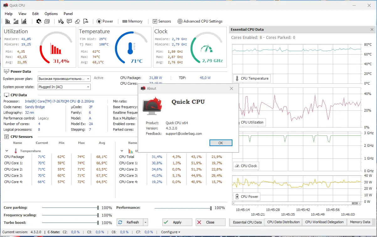 Quick CPU — это мощное приложение для точной настройки и мониторинга производительности вашего процессора. Оно позволяет управлять такими параметрами, как частота, параметры питания, C-States, Turbo Boost, Speed Shift и FIVR Контроль. Точное регулирование и контроль позволяют оптимизировать работу системы, повысить эффективность и протестировать возможности разгона. Программа совместима с различными версиями Windows и доступна для бесплатного использования, что делает её незаменимым инструментом для продвинутых пользователей и системных администраторов.