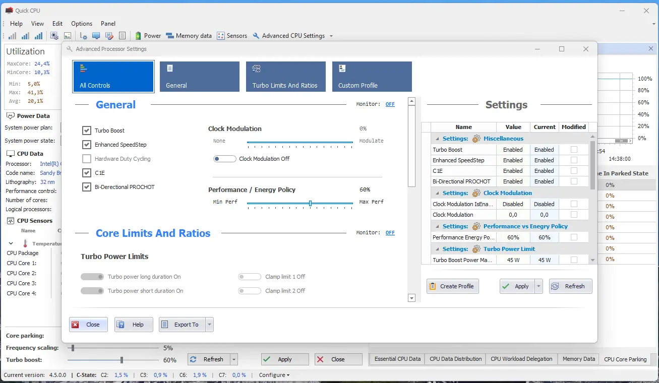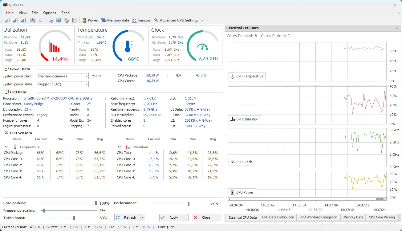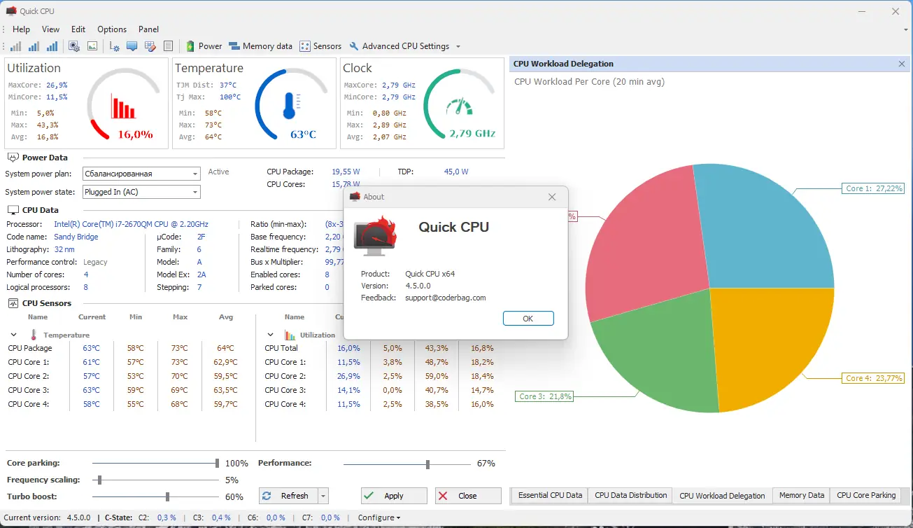 Quick CPU — это мощное приложение для точной настройки и мониторинга производительности процессора, а также параметров питания и напряжения. Оно предназначено для пользователей, желающих оптимизировать работу системы, осуществлять разгон процессора, управлять частотой, охлаждением и энергосбережением. Обеспечивая удобный интерфейс, программа позволяет контролировать такие параметры, как парковка ядер, Turbo Boost, C-States, Speed Shift и FIVR Контроль, что делает её незаменимым инструментом для опытных пользователей и профессионалов.