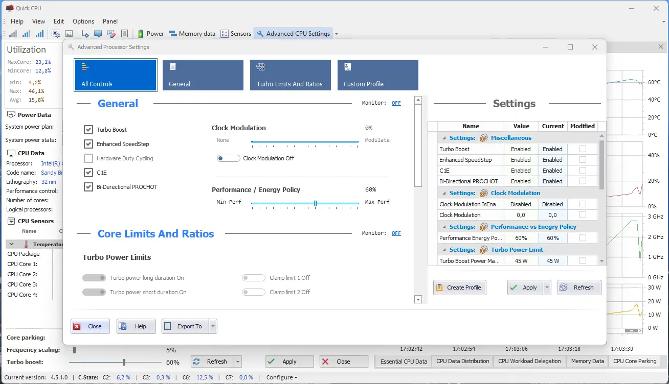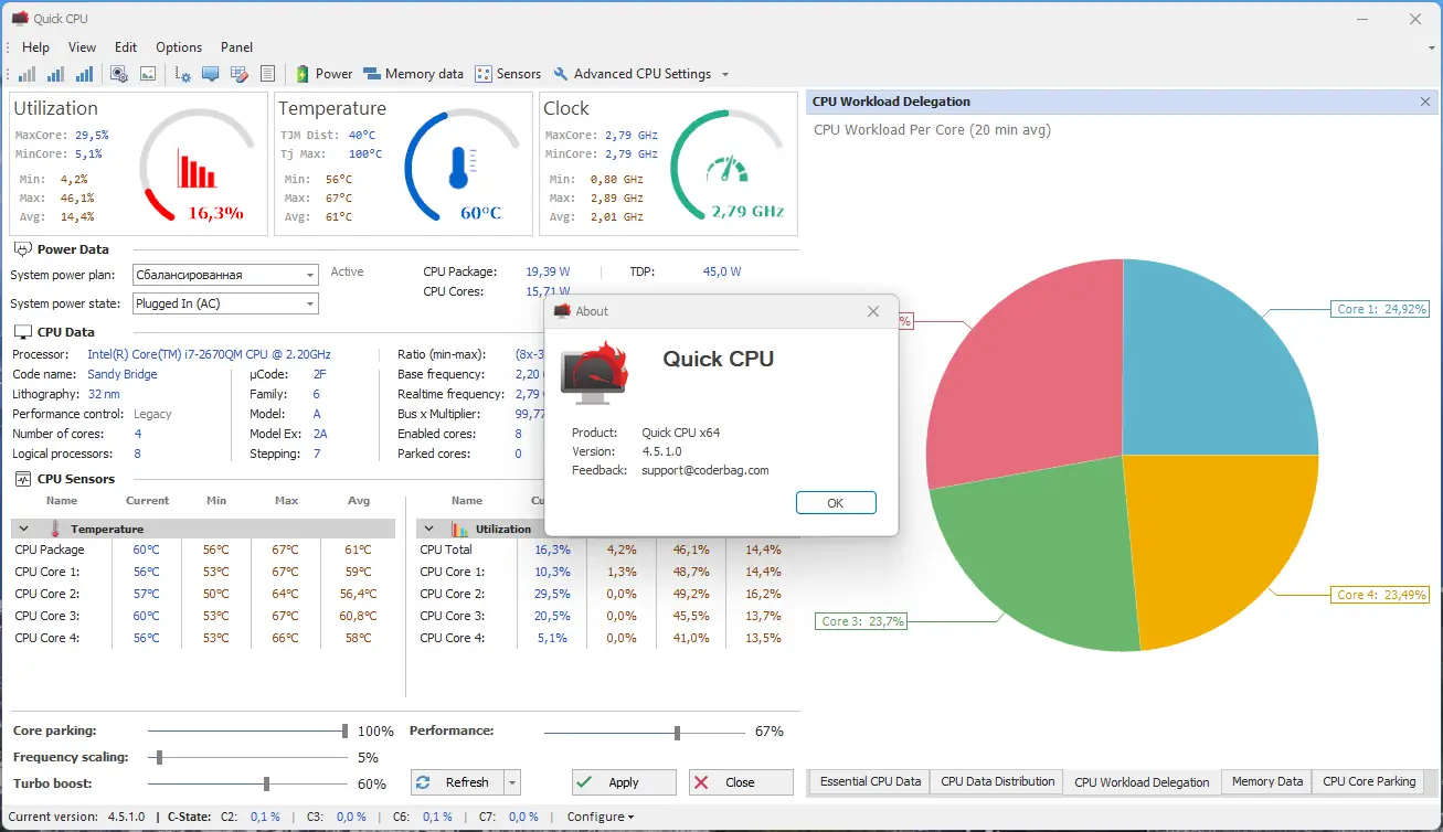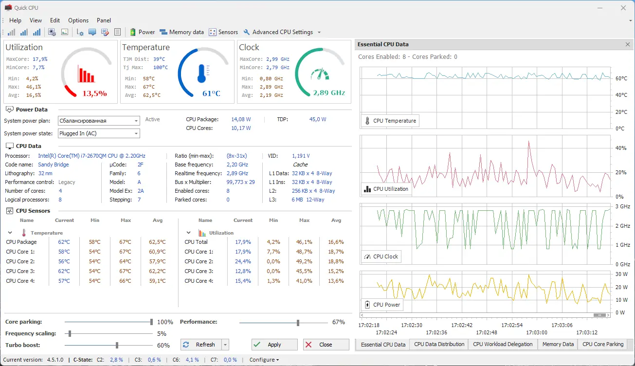 Quick CPU — это мощное приложение для точной настройки и мониторинга производительности вашего процессора. Оно позволяет оптимизировать работу системы, контролировать параметры питания и напряжения, а также управлять ядрами и энергосбережением в реальном времени.
