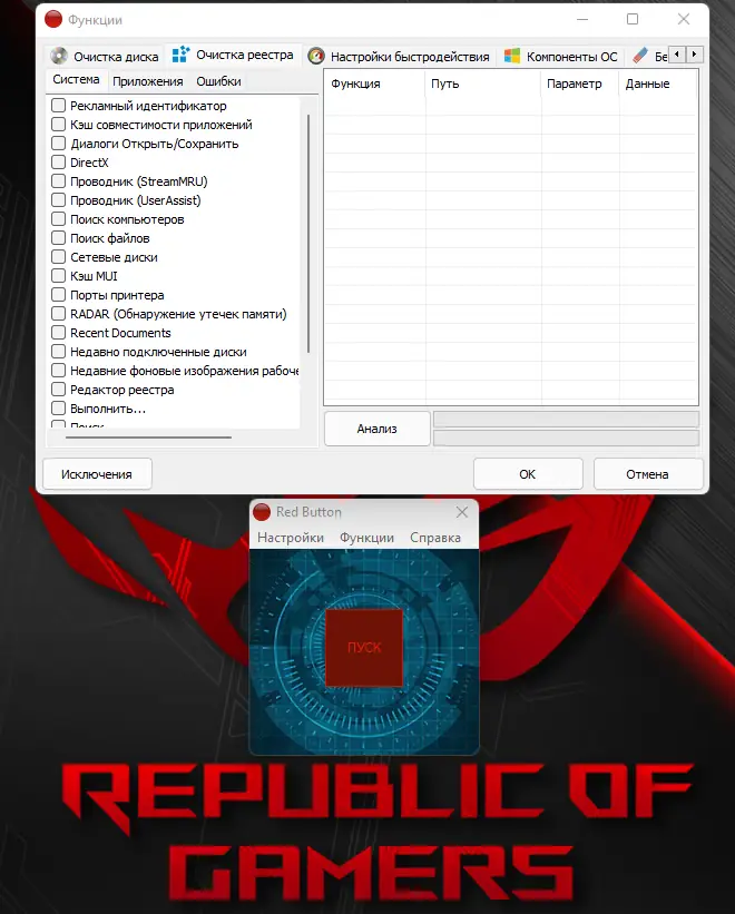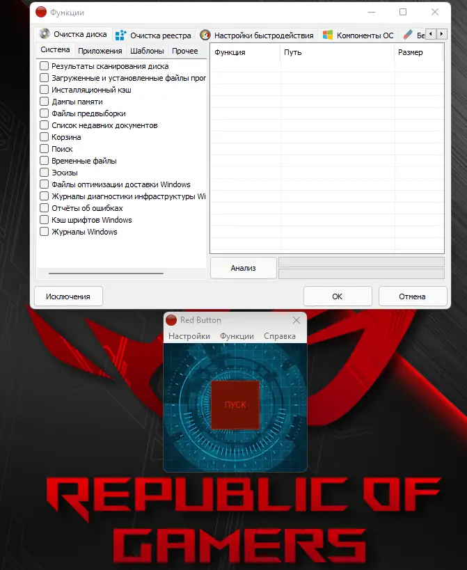 Red Button — это мощная утилита для оптимизации и очистки всех актуальных клиентских версий операционной системы Windows. Она обеспечивает быстрое и эффективное улучшение работы системы за счет удаления ненужных файлов, отключения лишних компонентов и изменения скрытых настроек.