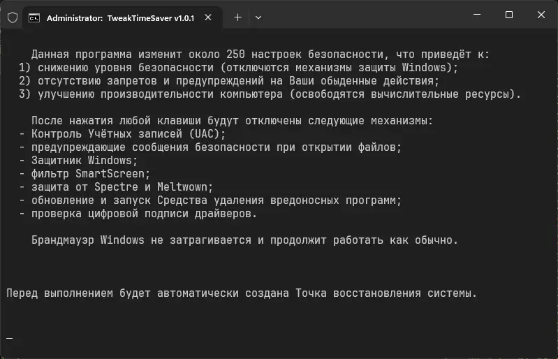 Этот инструмент представляет собой коллекцию готовых сценариев, с помощью которых можно быстро применить комплекс настроек Windows 10 и 11, создавая удобную и менее навязчивую среду. TweakTimeSaver создан для тех, кто ценит время и хочет получить стабильно работающую систему без лишней «тюнинга» и «рекомендаций». Он подходит как для новичков, так и для опытных пользователей, позволяя отказаться от сторонних твикеров и настроек вручную.
