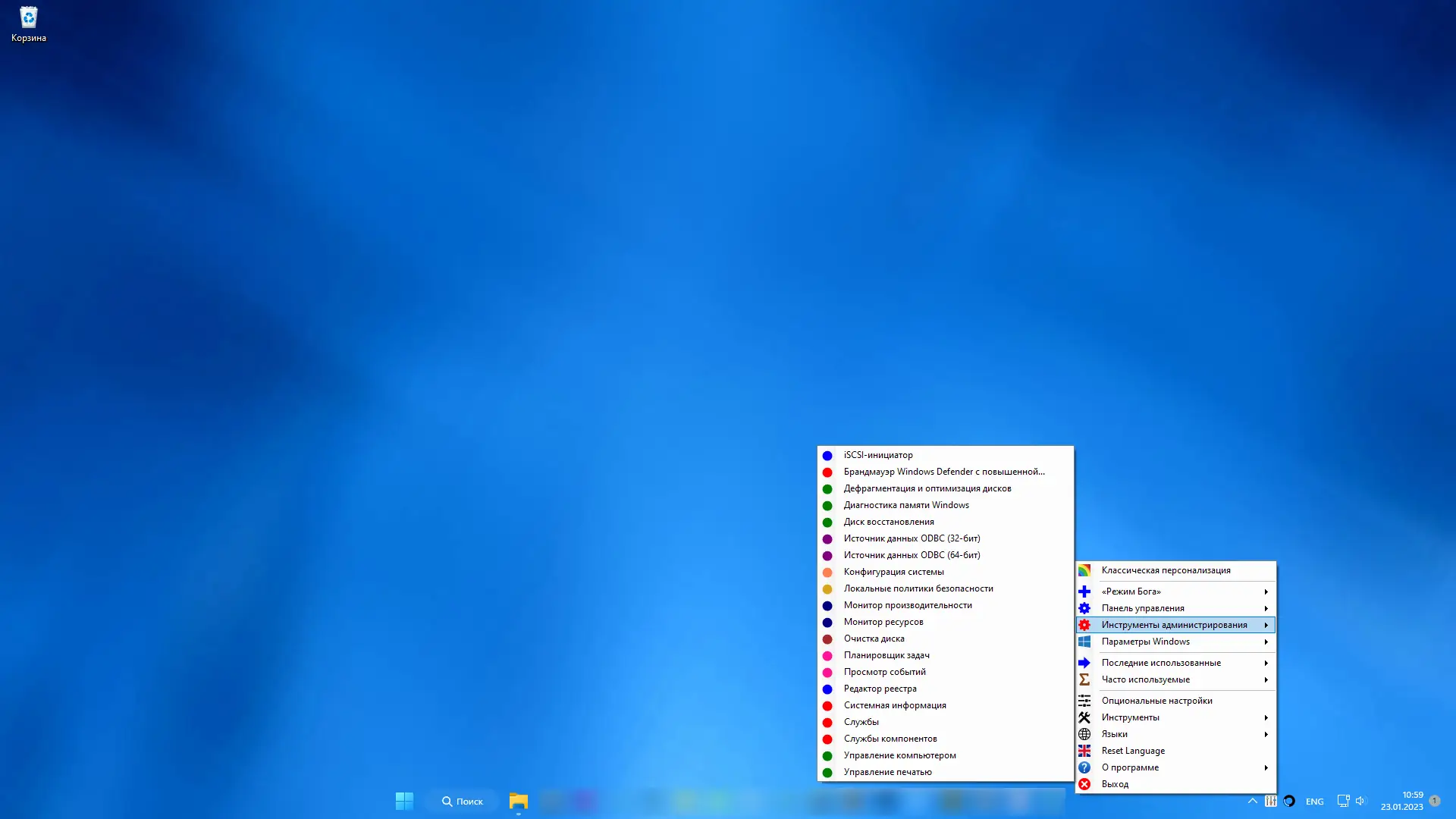 - Быстрый доступ к папке «Режим бога» со всеми элементами панели управления и средствами администрирования