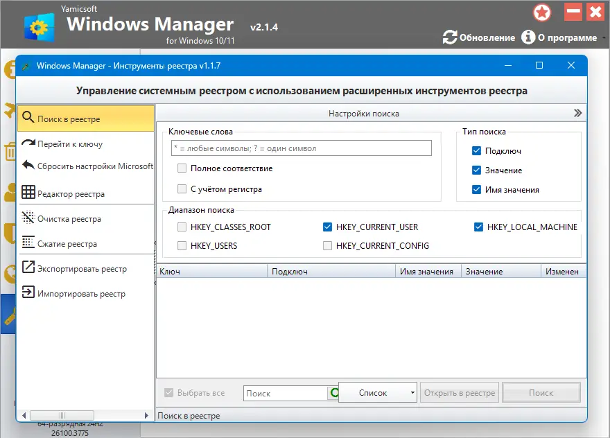 Windows Manager — это многофункциональный набор утилит, разработанных для облегчения работы с операционной системой Windows 10 и 11. Он позволяет быстро и эффективно осуществлять системные настройки, устранять ошибки, очищать диск и реестр, а также персонализировать интерфейс. Встроенные инструменты делают возможным создание точек восстановления, управление автозагрузкой, анализ дискового пространства и обеспечение безопасности данных. Благодаря интуитивному интерфейсу даже неопытные пользователи смогут самостоятельно поддерживать свою систему в отличном состоянии, исключая необходимость обращения к специалистам.