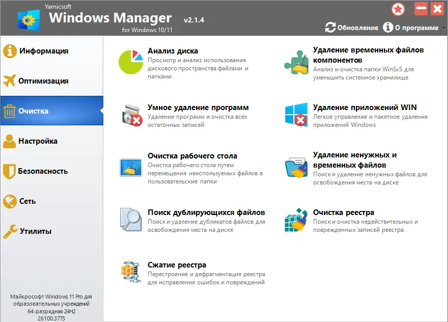 - Быстрая очистка ненужных файлов, удаление дублирующихся данных, управление дисковым пространством и реестром.