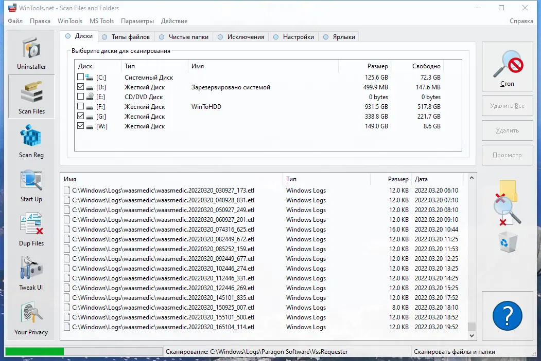 - Очистка временных файлов и ускорение работы компьютера с помощью инструмента Scan Files.