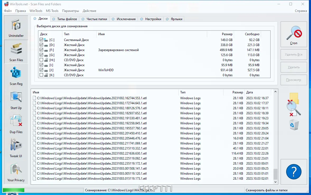 - Очистка временных файлов для освобождения дискового пространства и ускорения работы системы с помощью инструмента «Scan Files».