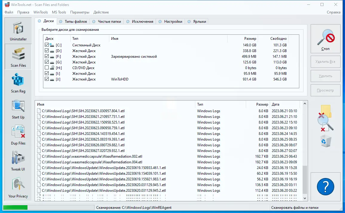 - Очистка жесткого диска от временных и ненужных файлов с помощью инструмента «Scan Files».
