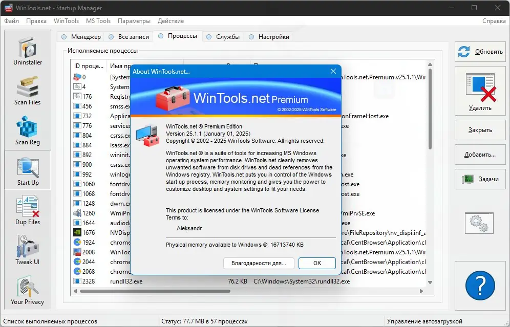 Позволяет эффективно очищать систему от остатков удалённых программ, включая временные файлы и записи в реестре, тем самым освобождая место и ускоряя работу диска. Инструмент «Scan Files» обеспечивает удаление временных и неиспользуемых файлов, предотвращая их накопление и связанные с этим задержки. Модуль «Scan Registry» помогает очищать реестр Windows, устраняя устаревшие или ошибочные записи и повышая производительность системы. Средство «Start Up Manager» контролирует автозапуск программ, позволяя останавливать и изменять их параметры загрузки, что способствует ускорению запуска ОС. Набор «Tweak UI» предоставляет расширенные настройки для повышения безопасности, удобства и эффективности работы системы, позволяя настраивать системные папки, элементы интерфейса, параметры загрузки и системные политики.