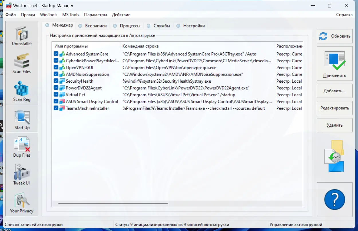 - Контроль автозагрузки и управление записями через «Start Up Manager»