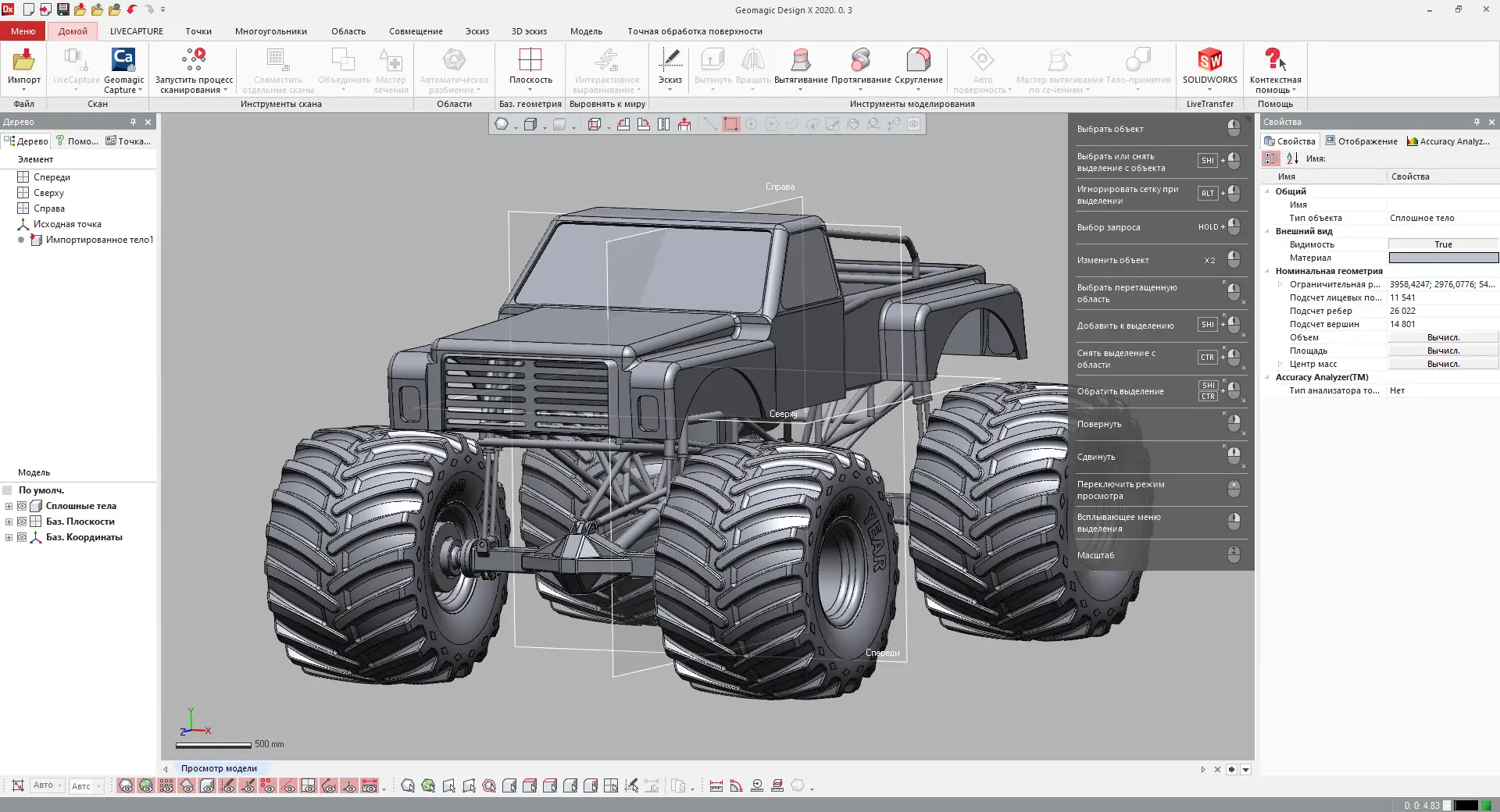 Процесс работы с Geomagic Design X включает интеграцию с популярными системами САПР, такими как SOLIDWORKS, Siemens NX, Autodesk Inventor и PTC Creo. Благодаря технологии LiveTransfer модель передается и редактируется прямо в привычной среде САПР по правилам прямых интерфейсов, сохраняя параметры и дерево построений. Программа позволяет точно получать поверхности и твердотельные элементы на базе 3D-сканов, редактировать вспомогательную сетку кривых, объединять облака точек и оптимизировать поверхность с помощью простых и эффективных инструментов.