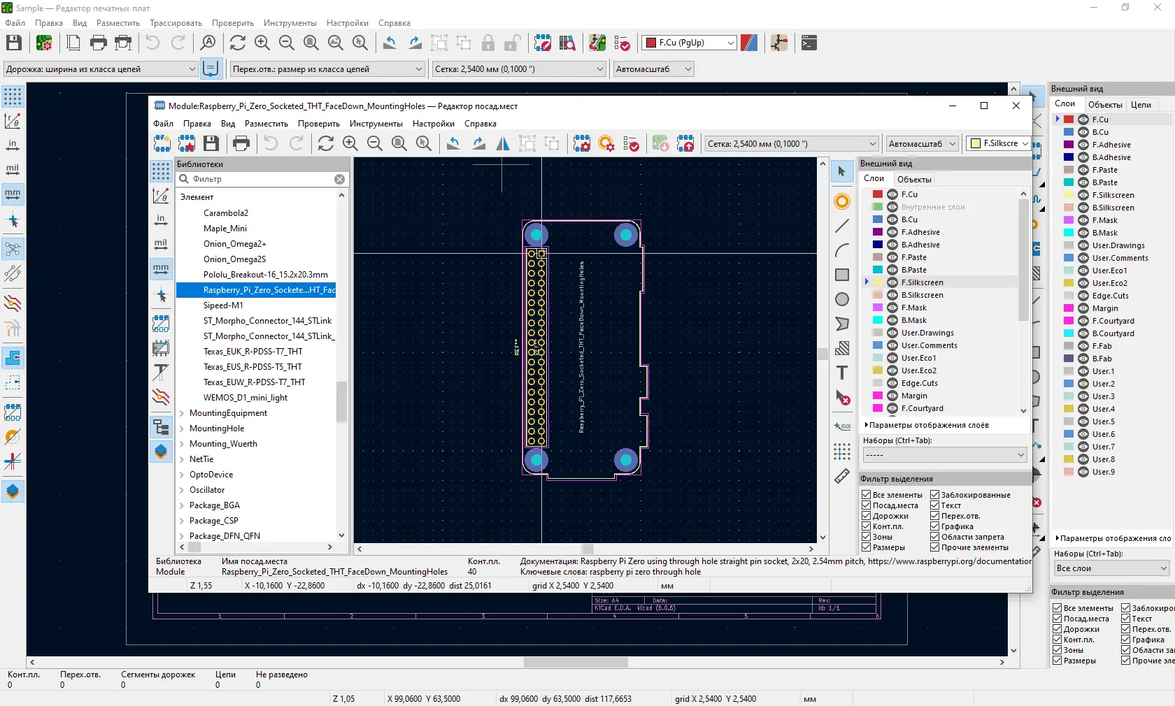 - Редактор печатных плат — pcbnew, с возможностью настройки посадочных мест