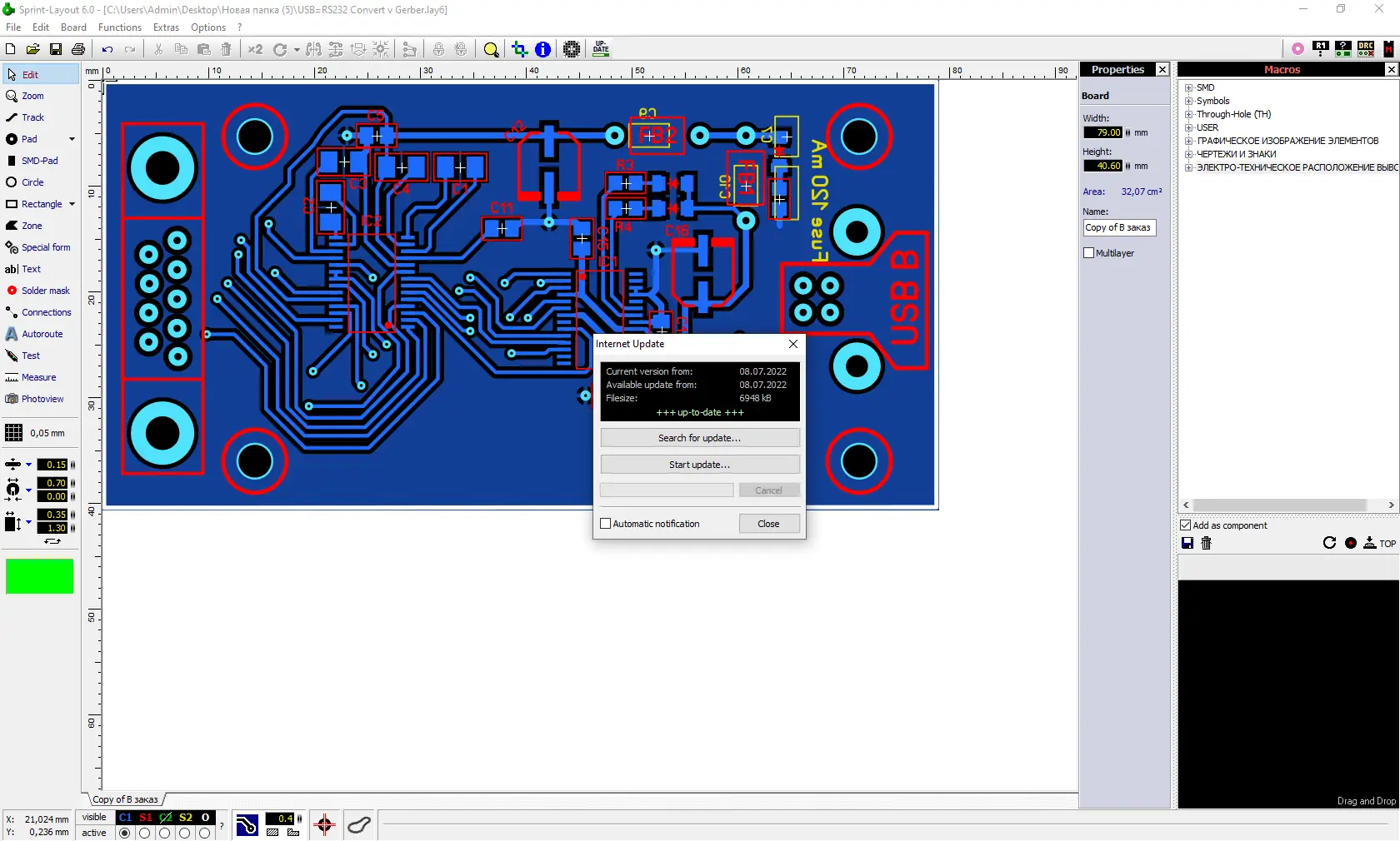 Sprint-Layout — это быстрая и простая в использовании программа для создания и редактирования печатных плат. Обладает поддержкой до 7 слоёв, автоматической разводкой дорожек и возможностью импорта и экспорта файлов Gerber и HPGL. Встроенный конструктор footprint позволяет удобно работать с компонентами, а гибкая система редактирования макросов делает программу особенно привлекательной для специалистов.