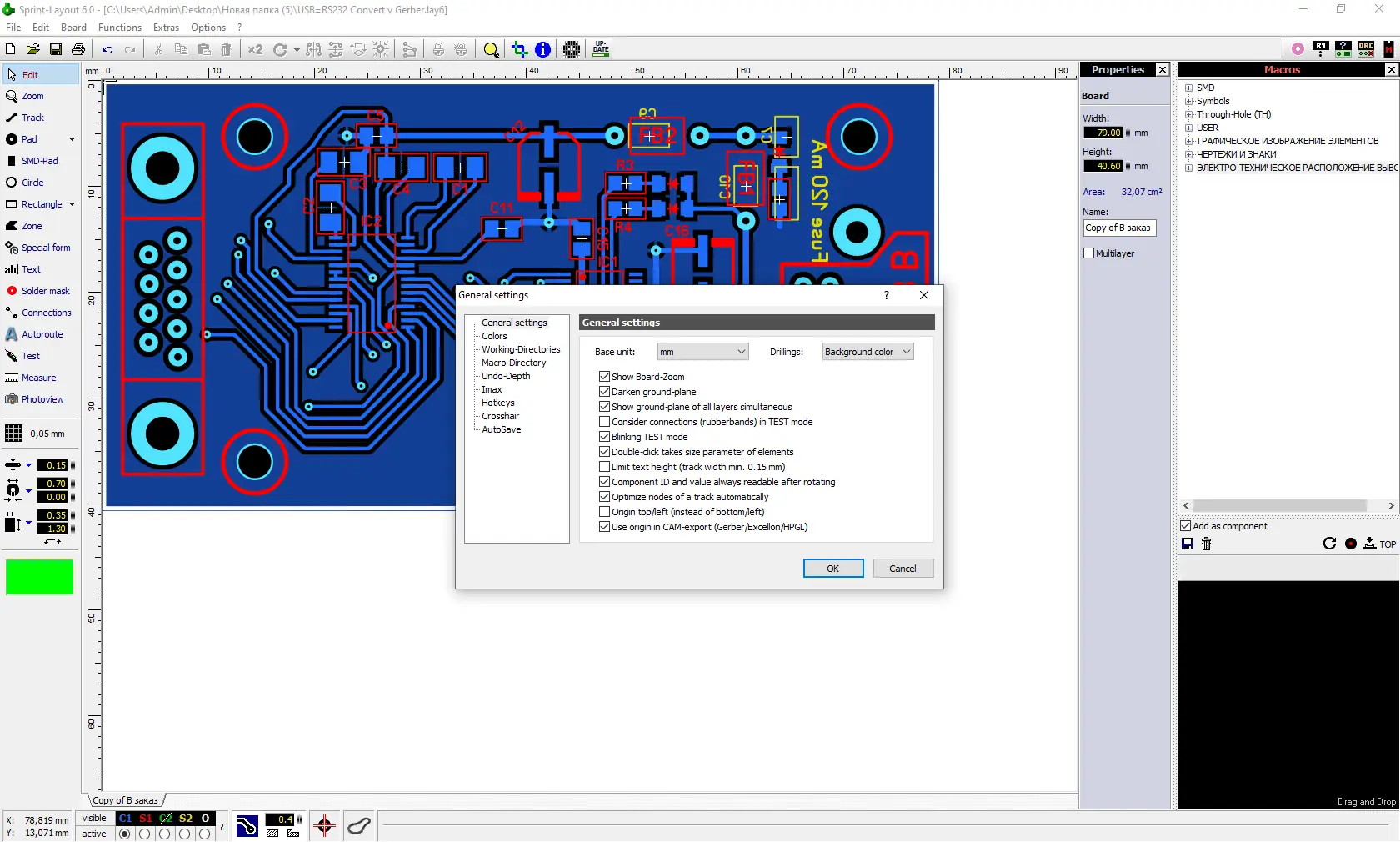 - Импорт и экспорт в форматах Gerber и HPGL
