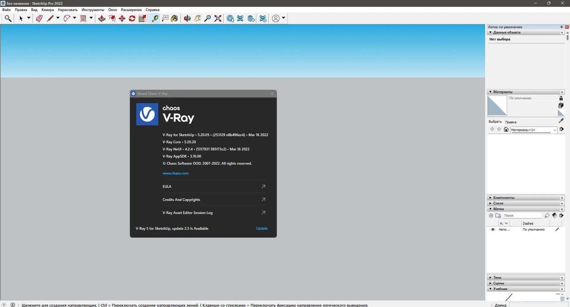 - Запустите SketchUp. После запуска на рабочей области появятся новые группы иконок плагина V-Ray. При желании, закрепите их на панели инструментов или закройте, оставив скрытыми.