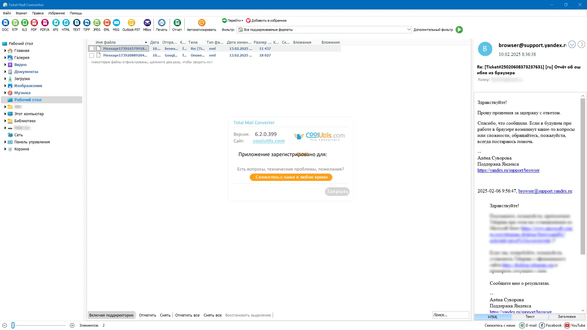 - Конвертация файлов MSG и EML в форматы TXT, PDF, HTM, RTF, DOC, TIFF;