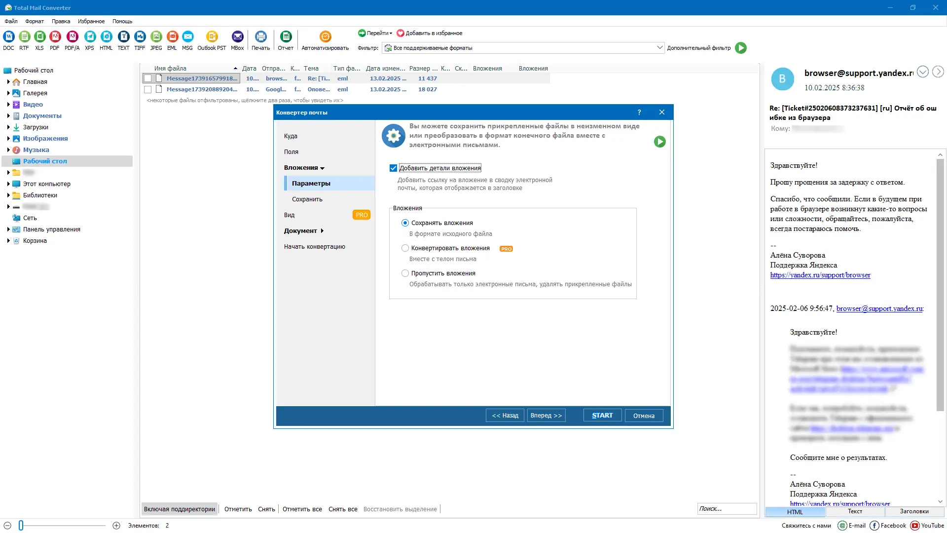 Обеспечивая быстрое и надежное конвертирование электронных писем из любых почтовых клиентов, программа Total Mail Converter позволяет преобразовывать файлы .msg и .eml в форматы TXT, PDF, HTM, RTF, DOC, TIFF. Это удобное решение для тех, кто хочет организовать хранение и просмотр входящей почты в удобных форматах, избавившись от лишних писем в почтовом ящике и расширив возможности просмотра старых сообщений.