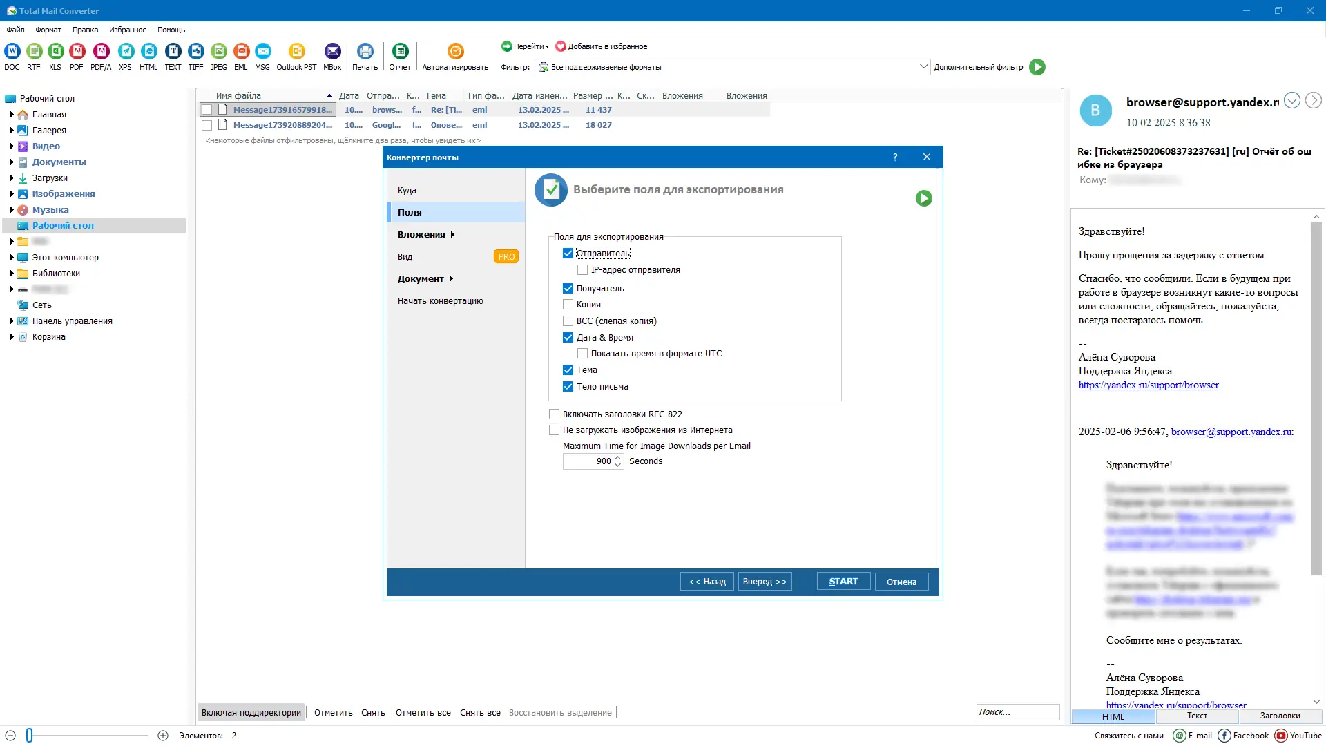 - Настройка полей экспорта: Отправитель, Получатель, Дата, Название, Тело письма;