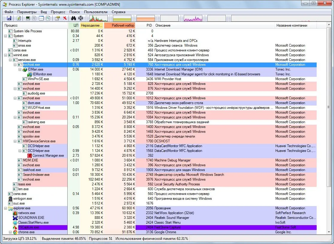 Process Explorer – это небольшая и при этом мощная программа с интуитивным интерфейсом, предназначенная для мониторинга процессов в системе в режиме реального времени. В бесплатной версии она предоставляет детальную информацию о каждом запущенном процессе, что помогает пользователям быстро находить и устранять системные проблемы.