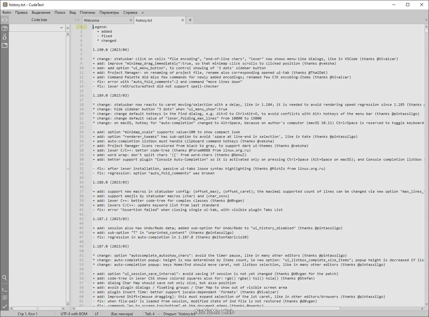 CudaText — это полностью бесплатный мультиплатформенный редактор текста, ориентированный на разработчиков и специалистов по программированию. Благодаря поддержке подсветки синтаксиса и встроенных шаблонов, он значительно ускоряет процесс написания кода. Программа поддерживает более полутора сотен языков программирования и предоставляет широкий набор инструментов для эффективной работы с текстами и кодом, включая работу с несколькими группами проектов, вкладками и документами с разными типами разметки. Расширяемость за счет плагинов на языке Python делает CudaText гибким и мощным инструментом для пользователей различных уровней.