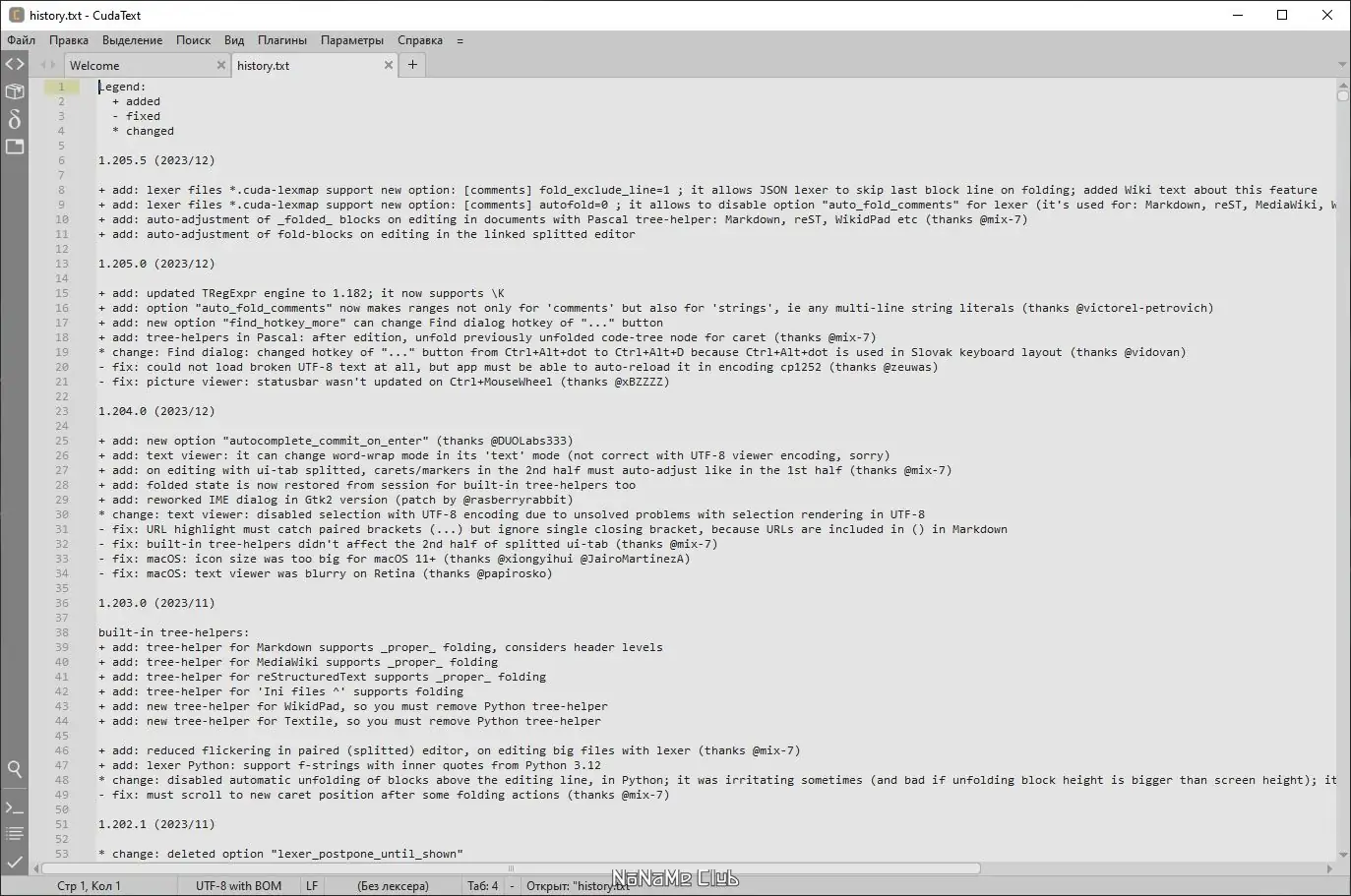 CudaText — это полностью бесплатный мультиплатформенный редактор текста, специально предназначенный для написания и редактирования кода. Он обладает поддержкой подсветки синтаксиса и готовых блоков кода для быстрой вставки, что значительно ускоряет работу разработчика. Программа поддерживает около полутора сотен языков программирования, что делает её универсальным инструментом для программистов различной направленности. Благодаря возможности работы с несколькими группами проектов одновременно, открытию множества вкладок и документов с самостоятельными типами разметки, пользователи получают гибкость и удобство в работе. Расширяемость с помощью плагинов на языке Python позволяет значительно расширять функционал, внедряя дополнительные инструменты для повышения эффективности. Встроены функции завершения тегов HTML и CSS, настройка горячих клавиш и другие удобства, что делает CudaText современным и мощным редактором кода, не требующим инсталляции и полностью пригодным для использования в любой ситуации.