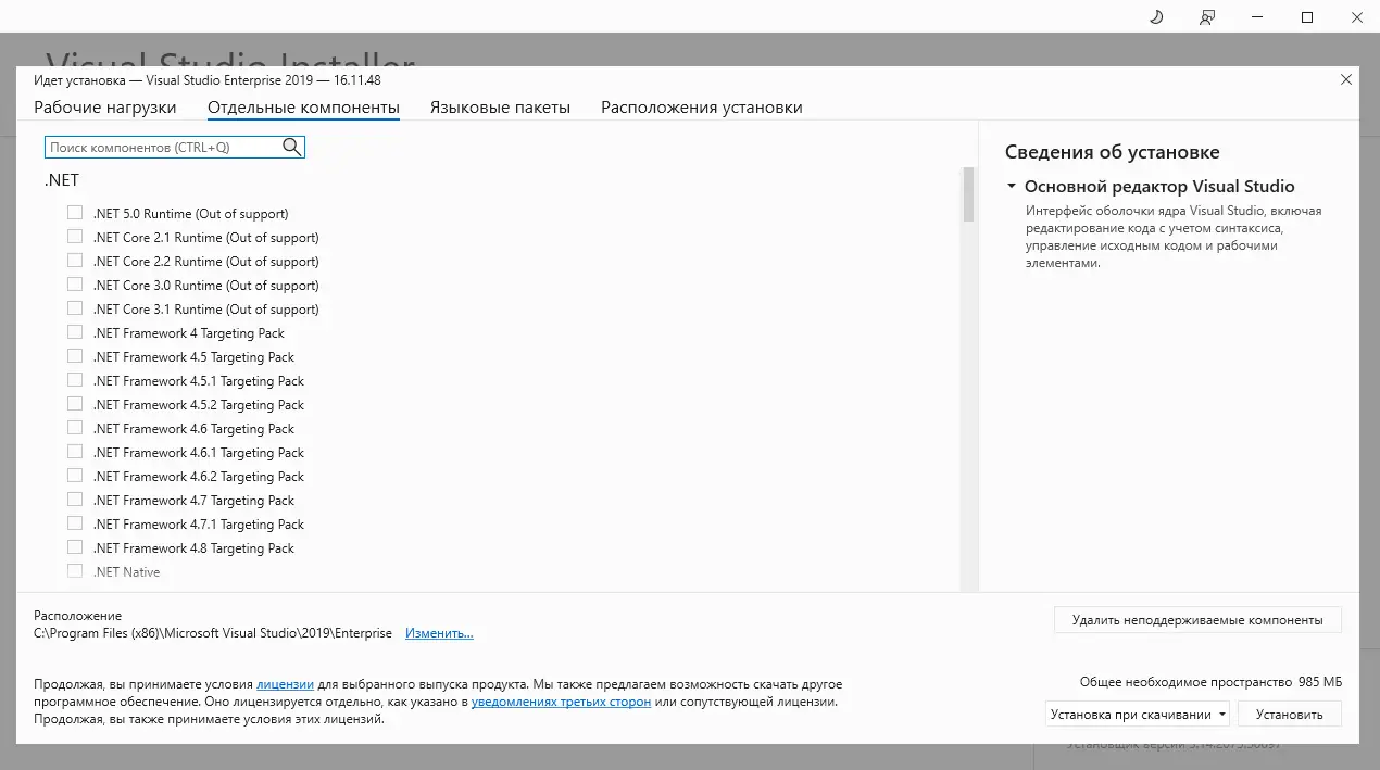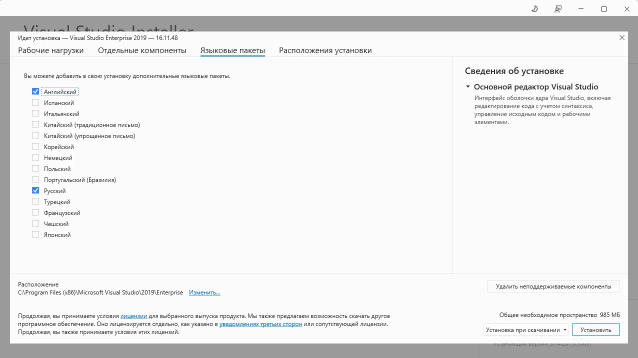 Обратите внимание, что для корректной работы рекомендуется установить Visual Studio на SSD-накопитель и иметь достаточно свободного места.