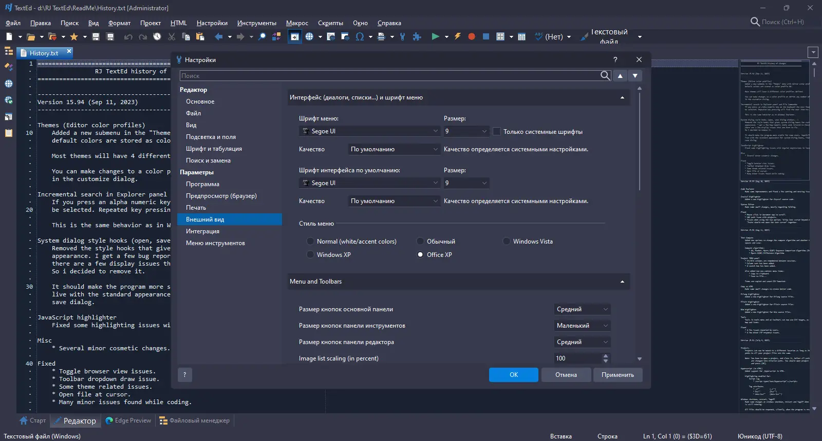 Этот редактор отличается высокой производительностью, поддержкой различных кодировок (ANSI, UTF-8, Unicode, Unicode BE) и возможностью настройки подсветки синтаксиса для множества языков. RJ TextEd обладает функциями выделения текста столбцом, сворачивания отдельных секций кода и автоподстановки тегов при верстке HTML-страниц. Встроенные инструменты позволяют работать с каскадными таблицами стилей CSS, а также автоматически вставлять стандартные команды и функции для jаvascript и PHP. Из боковой панели можно получить доступ к дереву каталогов, FTP-клиенту, буферу обмена и папке «Избранное» браузера IE. Возможности программы позволяют перейти непосредственно в двухпанельный менеджер файлов или просмотреть предварительный просмотр HTML-файла, что значительно ускоряет работу разработчика.