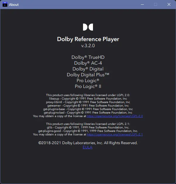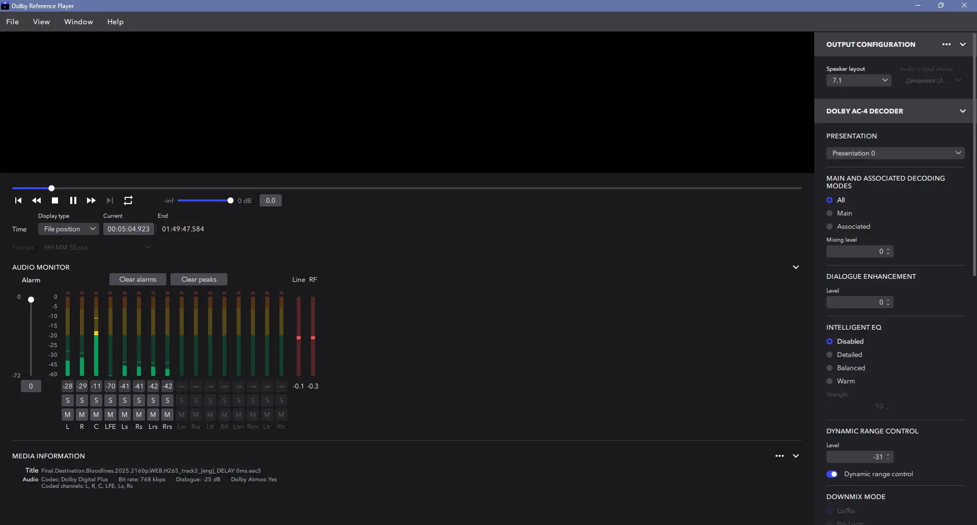 Приложение с пользовательским интерфейсом для воспроизведения и оценки качества звука, поддерживающее работу с файлами Dolby Digital®, Dolby Digital Plus™, Dolby TrueHD, Dolby AC-4 и Dolby Atmos®. Оно позволяет контролировать уровень звука по всем каналам, а также осуществлять рендеринг Dolby Atmos для конкретных конфигураций динамиков. Проигрыватель дает ценную информацию о потоке битов, что делает его незаменимым инструментом для аналитиков и инженеров, занимающихся качеством аудиопродукта. Dolby Reference Player является полностью автономным и совместимым с системами Windows 7, Windows 8/8.1, Windows 10 и Windows 11 на 32 и 64 битах.