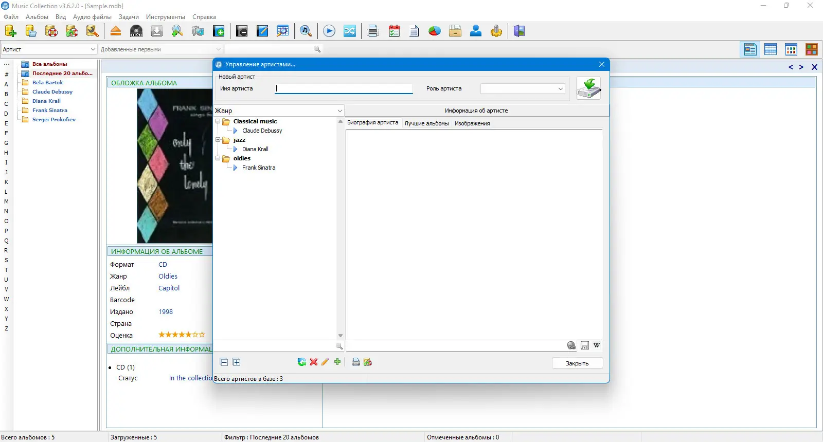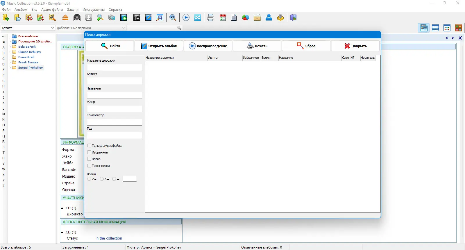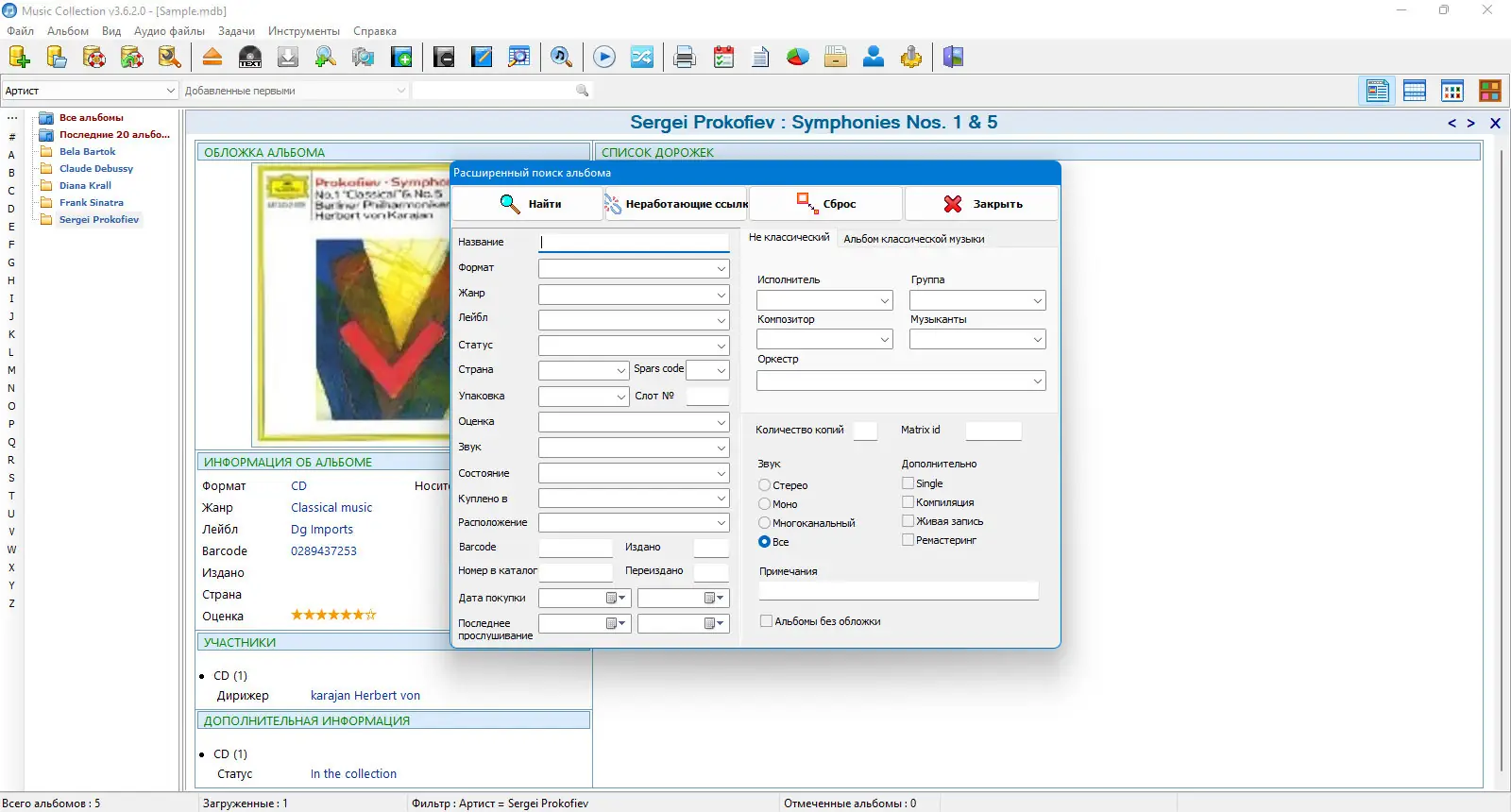 Music Collection — удобное решение для тех, кто ценит порядок в своей музыкальной библиотеке. Вся информация о композициях, альбомах и исполнителях может быть легко редактирована или импортирована из интернета, что значительно сокращает время на управление коллекцией и снижает риск ошибок. Встроенные фильтры поиска позволяют быстро найти любой трек или альбом по исполнителю, жанру, названию и другим характеристикам. Также программа позволяет распечатывать информацию, что удобно для коллекционеров и любителей физического носителя.
