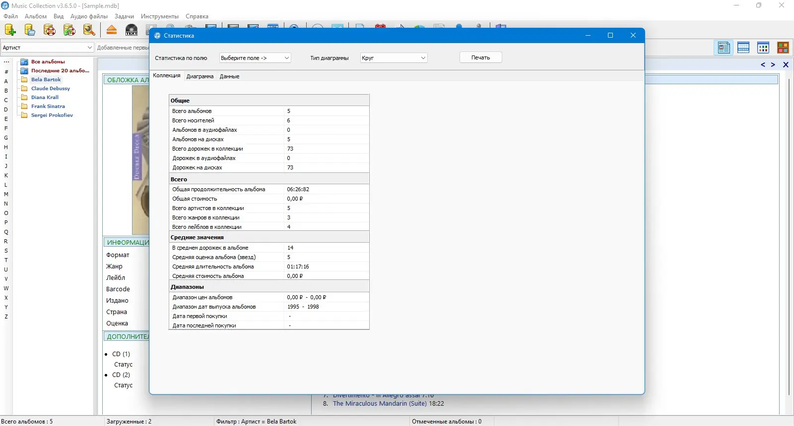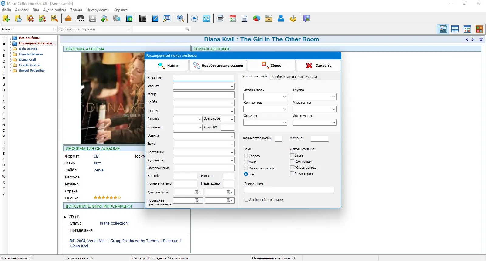 Music Collection — это универсальная программа для создания и управления собственной музыкальной коллекцией на компьютере. Она позволяет легко отредактировать информацию о композициях, альбомах и исполнителях, быстро находить нужные треки и сохранять полную картину вашей музыки.