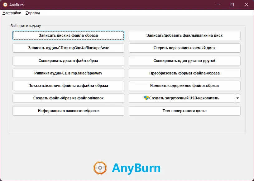AnyBurn — это небольшая бесплатная утилита для управления CD, DVD и Blu-ray дисками, которая предлагает широкий спектр функций для работы с дисками и образами.