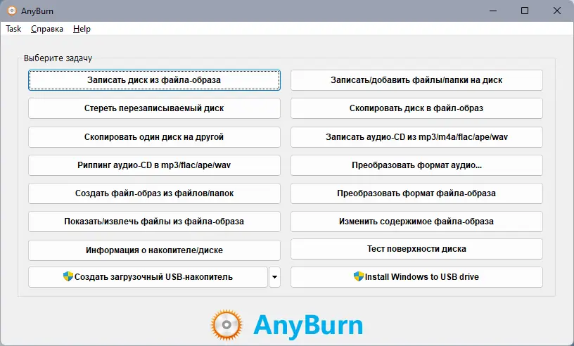 AnyBurn — это небольшая бесплатная утилита для работы с CD, DVD и Blu-ray дисками, предлагающая удобный интерфейс и широкий функционал. Она предназначена для выполнения различных операций с оптическими накопителями, включая создание, запись и копирование образов, а также риппинг аудио-CD и создание загрузочных USB-носителей. Благодаря простоте использования и высокой скорости работы, это решение станет эффективной альтернативой более сложным платным программам.