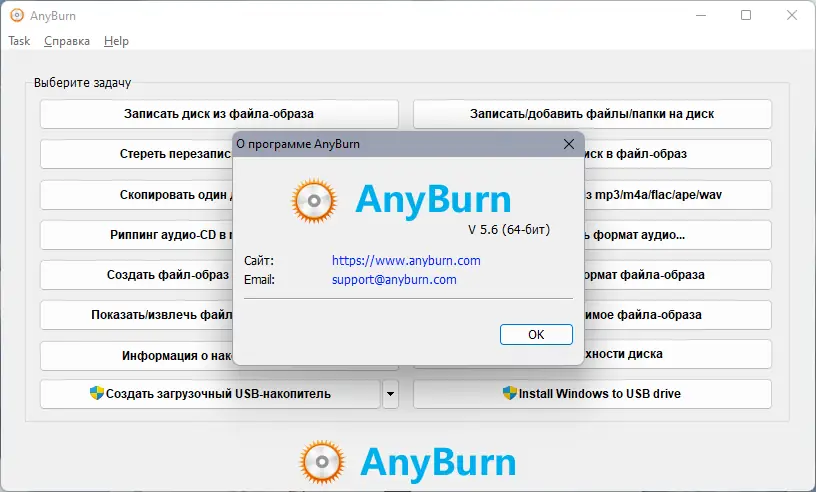 AnyBurn совместима с современными системами Windows и требует минимальных ресурсов для корректной работы. Это делает её подходящим инструментом для использования на большинстве ПК и ноутбуков.