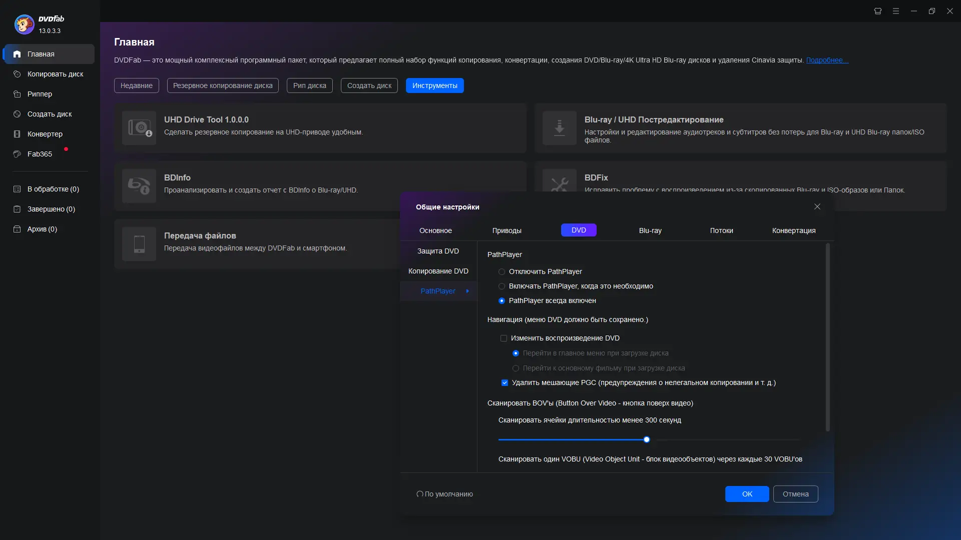 Данный программный продукт представляет собой мощное решение для работы с видео на физических носителях. Он способен копировать все содержимое диска или только основной фильм с выбором нужных звуковых дорожек и субтитров. Помимо этого, DVDFab позволяет создать персонализированные DVD или Blu-ray, обрезать рекламу, объединять и разделять материалы, а также пережимать диски формата DVD9 в более компактный DVD5 без значимых потерь качества. Функционал включает запись образов, поддержку различных форматов и форматов видео высокого разрешения, а также автоматическую обработку современных защит.