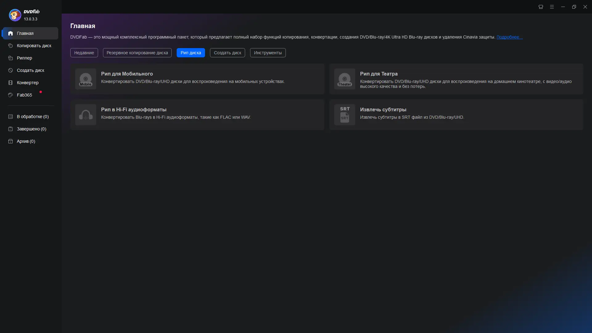 DVDFab — универсальный инструмент для копирования, риппинга и конвертации DVD и Blu-ray дисков с широкими возможностями гибкой обработки видео. Обеспечивает снятие защит и ограничений, а также позволяет сжимать и разбивать фильмы на несколько дисков с минимальной потерей качества. Поддержка русского языка, интуитивный интерфейс и высокая скорость работы делают его ведущим решением в своей категории.