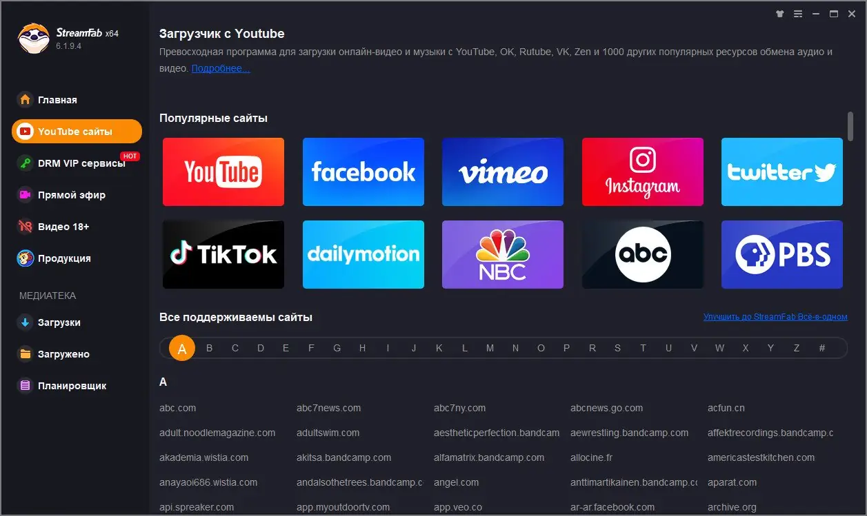 - Поддержка загрузки и конвертации видео с ведущих онлайн-сервисов