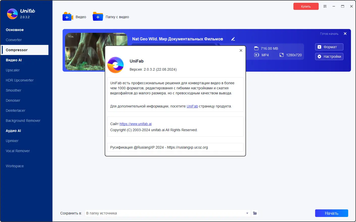 UniFab (Repack & Portable) от DVDFab — это комплексное решение для работы с мультимедиа-файлами. Благодаря интеграции AI-улучшения видео и звука, программа способна автоматически повышать качество видео до HDR10 или Dolby Vision и звука до EAC3 5.1 или DTS 7.1. Она позволяет сжимать, редактировать, объединять файлы, добавлять внешние субтитры и водяные знаки, а также поддерживает аппаратное ускорение CUDA, AMD и Intel QVS. В состав входит три основных раздела — Основной, Видео AI, Аудио AI, а также шесть модулей: Video Converter, Video Enlarger AI, AI Deinterlace, Audio Upmix AI, HDR Upscaler AI и Smoother AI для расширенных возможностей обработки видео.