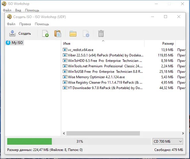 - Конвертация файлов из поддерживаемых форматов в ISO