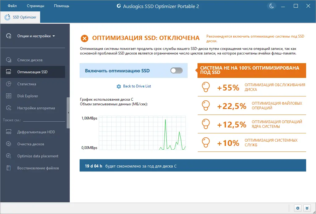 Auslogics SSD Optimizer — это мощное решение для владельцев SSD, позволяющее максимально использовать потенциал ваших накопителей. Программа автоматически анализирует и настраивает параметры работы диска, снижая количество операций записи и повышая его скорость. Благодаря удобным функциям проверки состояния, управления пространством и запуску операций по расписанию, вы сохраняете контроль над состоянием накопителя и обеспечиваете его долгую и надежную работу.