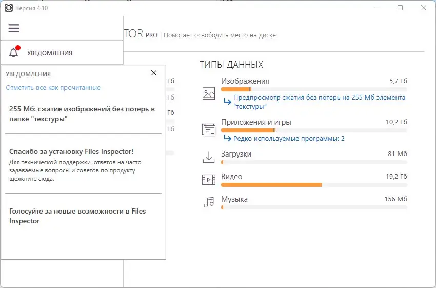 Если на диске заканчивается свободное место или невозможно определить, чем оно занято, Files Inspector – это решение, которое поможет вам быстро и точно выявить крупные и ненужные файлы, загруженные видео, фильмы, а также неиспользуемые программы. Благодаря интуитивно понятному интерфейсу и расширенным возможностям, программа позволяет не только проводить экспресс-анализ, но и тщательно исследовать все содержимое дисков для более глубокого выявления мусора и потенциальных зон для освобождения пространства. Надежное удаление с помещением удаляемых элементов в корзину гарантирует безопасность ваших данных.
