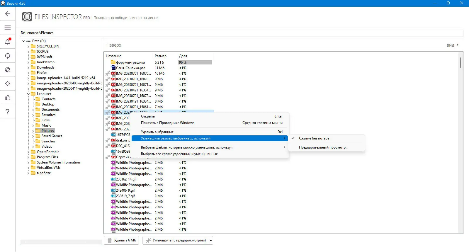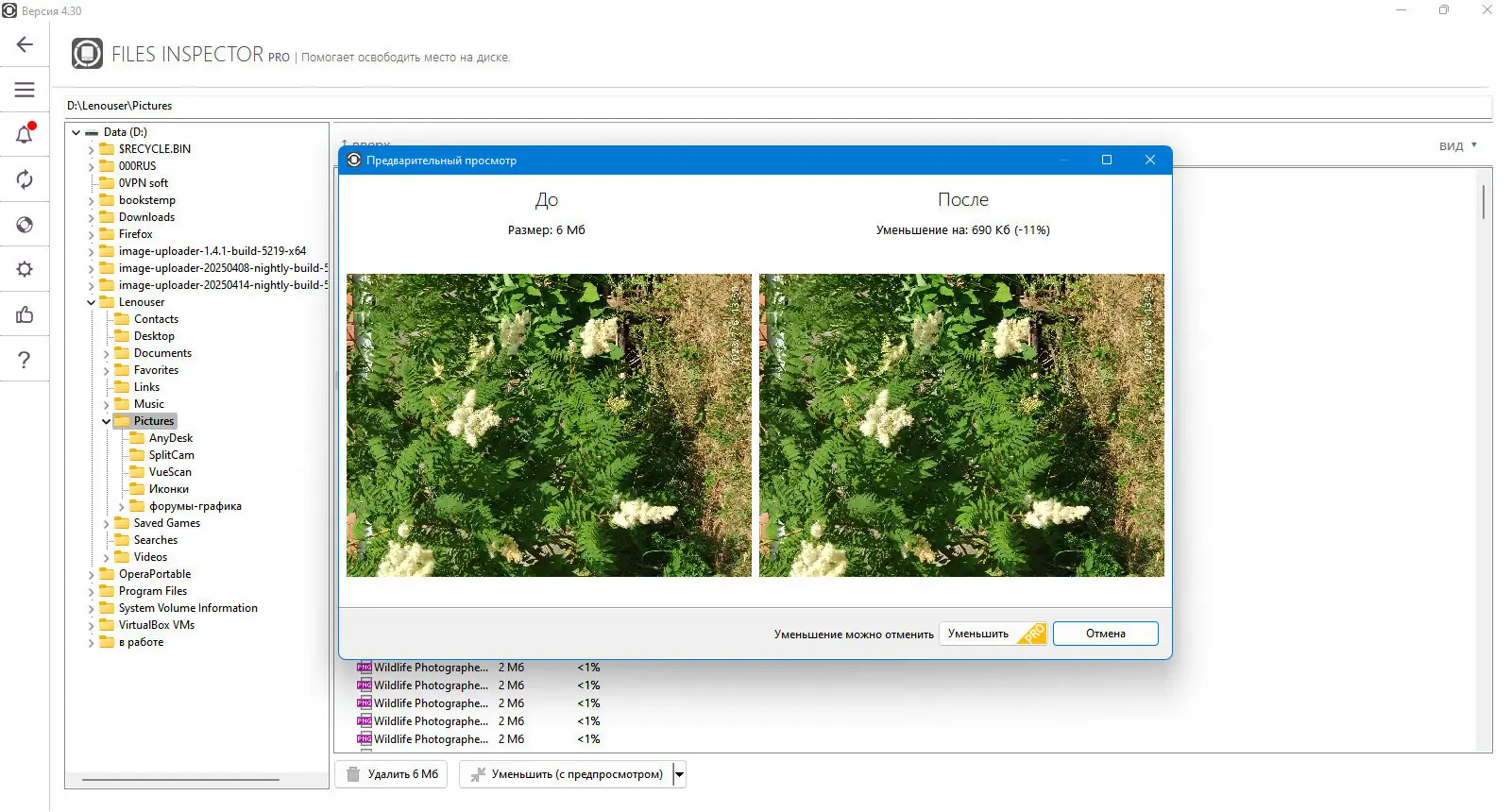 Также в версии PRO есть возможность сжатия фотографий без потери качества, что дополнительно помогает экономить место на диске, снижая объем изображений примерно на 10%. Обновления и новые функции позволяют сделать процесс очистки максимально эффективным, а безопасное удаление файлов гарантирует их восстановление в случае ошибок.